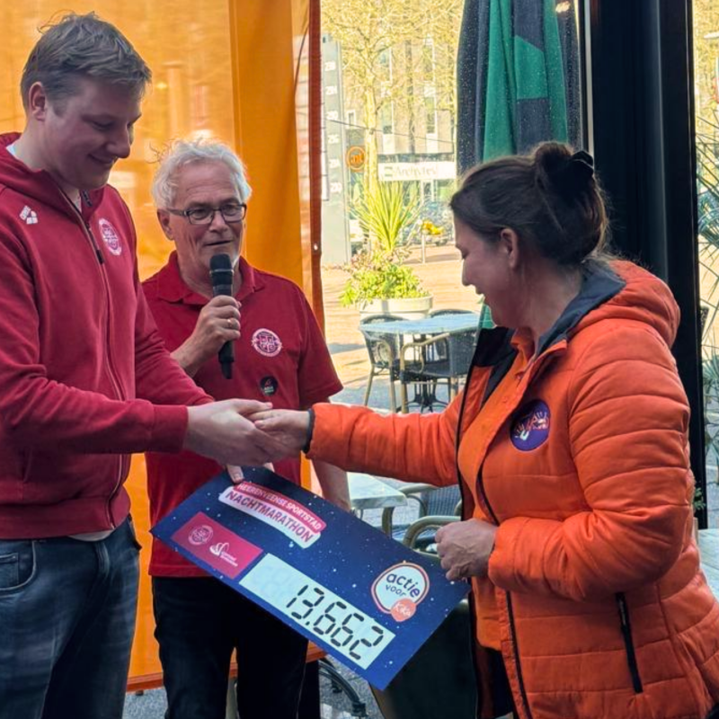 Tijdens de Nachtmarathon doken maar liefst 25 enthousiaste Sportstad‑medewerkers het water in. Samen vormden zij één van de tien deelnemende teams en zwommen zij in totaal 27.050 meter. Met elkaar haalden ze daarmee een prachtig bedrag van € 1.272,50 op voor het goede doel.